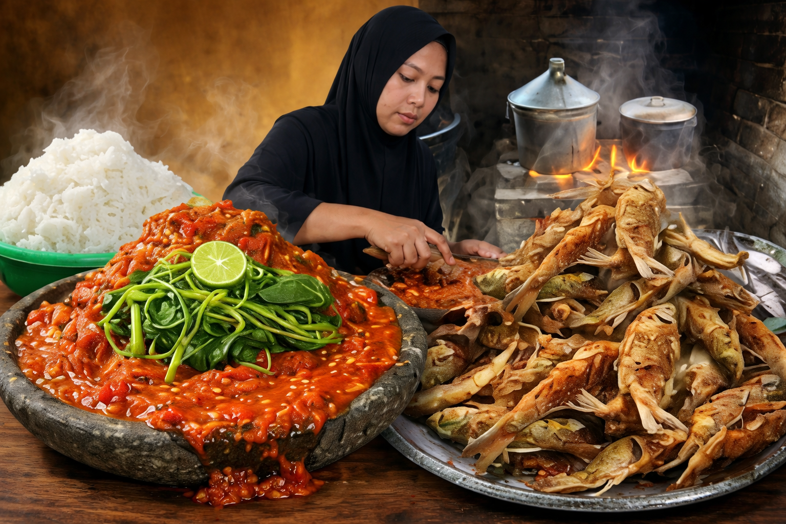 Proses memasak di warung ini pun masih mempertahankan kearifan lokal yang kian langka. Nasi dikukus menggunakan dandang di atas tungku kayu bakar — setiap dandang memuat hingga 6 kilogram beras dan hanya butuh waktu sekitar 10 menit untuk matang sempurna. Dalam sehari, proses pengukusan bisa berlangsung hingga lima kali putaran, mencerminkan betapa tingginya animo pengunjung yang datang silih berganti dari pagi hingga larut malam.