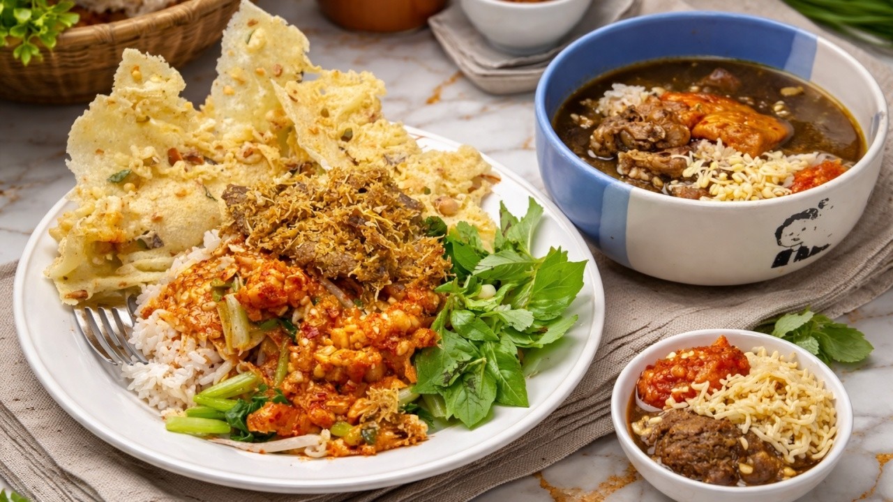 Menu andalan yang paling banyak dibicarakan adalah nasi pecel empal brewok. Nama “brewok” merujuk pada penggunaan serundeng yang menempel tebal di permukaan empal, menciptakan tekstur dan rasa yang unik — perpaduan gurih, manis, dan rempah yang meresap sempurna. Empal brewok ini dibuat sendiri oleh pihak warung, bukan produk jadi, sehingga cita rasanya terjaga keasliannya.